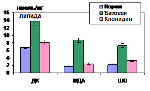 Цитопротекторное действие клонидина было исследовано в эксперименте на эмульсии фосфолипидов и суспензии митохондрий печени крыс (n=10) (эксперимент выполнен совместно с , ИТЭБ РАН). ПОЛ инициировали системой «Fe2+ + АТФ», способствующей образованию АФК и активации ПОЛ. Кинетика ПОЛ регистрировалась по потреблению О2. Концентрацию клонидина in vitro рассчитывали в соответствии с дозой, применяемой в эксперименте на животных – 100 мкг на кг массы (1 мл 0,01% официнального раствора). Эффективная концентрация клонидина составляла 10-9 М. Даже в такой низкой концентрации клонидин вызывает торможение ПОЛ в дисперсии фосфолипидов на 40%, а в мембранах митохондрий печени - на 35% (рис. 33,34). Такая выраженная антиоксидантная активность клонидина, по-видимому, обусловлена наличием в его структуре имидазольного кольца.
