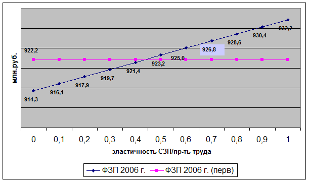 Зависимость величины расчётного фонда заработной платы от планового соотношения темпа роста средней заработной платы и производительности труда на предприятии (без учёта сокращения персонала) приведена на Рис. 2. Также на диаграмме приведено сравнение с первоначальным расчётом ФЗП по прежней системе оплаты труда.