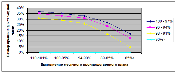 Рис. 3. Зависимость уровня текущей премии от выполнения производственного плана и качества продукции.
