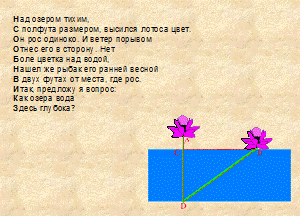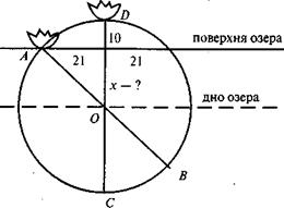 Решают эту задачу, опираясь на теорему (свойство хорд): если две хорды одного круга пересекаются, то произведение длин частей одной из них равняется произведению длин частей второй. Рассматривают рисунок и сразу понимают, как найти глубину озера (х):