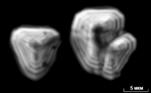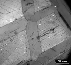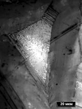 С увеличением дозы облучения или величины внедряемого заряда в SLN, в отличие от NSLN, не было обнаружено трансформации треугольных зародышей в гексагональную форму. При дальнейшем увеличении Q в SLN происходит, в основном, увеличение числа зародышей микронных размеров в облучаемой зоне кристалла Показано, что формирование методом поточечного электронно-лучевого рисования по полярному Z-срезу нелинейно-оптических кристаллов SLN, VTE SLT и NSLN периодических доменных структур происходит при взаимном влиянии вносимых электронным пучком зарядов. Впервые показано, что увеличение дозы облучения, также как и сужение пространственных интервалов между точками облучения для всех исследованных кристаллов меняют условия переключения в облучаемой зоне. При этом меняется как радиус доменов, так и их длина, а сужение интервалов между облучениями стимулирует прорастание доменов к противоположной стороне образца тонкой кристаллической пластины (рис. 15).