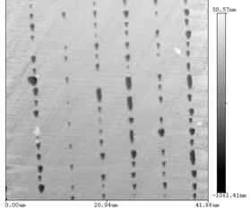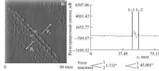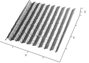Кроме того, в катионной подрешетке легированного РЗЭ кристалла ниобата лития формируется сверхструктурная подрешетка кластерных дефектов с шагом в несколько периодов трансляции, т. е. 1 – 2 нм [4]. Изучение образцов LiNbO3:РЗЭ с помощью атомно-силового микроскопа Nano-R2TM в режиме латеральных сил (в том числе и без предварительного химического травления) позволило определить периодические различия в упругих свойствах материала и исследовать диэлектрические особенности доменных границ (рис. 6).