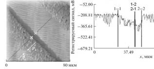 Исследование периодических структур методом растровой электронной микроскопии (РЭМ) на электронном микроскопе JSM-840A с использованием специального контролируемого заряжения полированной поверхности образца монокристалла LiNbO3:РЗЭ электронами первичного пучка с разной энергией (2–5 кэВ) [6] показало, что ширина и интенсивность наблюдаемых в РЭМ зарядовых изображений соответствует области распределения примеси в зоне границы, а интенсивность снижения сигнала вторичных электронов (ВЭ) зависит от концентрации примеси вблизи той или иной доменной границы (рис.8)