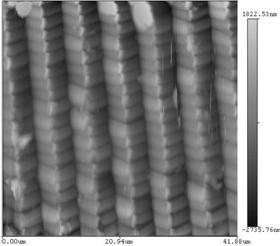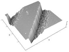 Рис. 6 - АСМ изображения, полученные при прямом (а) и реверсном (б) проходе кантилевера по поверхности образца LiNbO3:Gd [Gd = 0.44 мас.%] с периодом РДС Λ = 60 мкм. демонстрируют изменение локальной силы трения вблизи границ “хвост-к-хвосту” | Рис. 7 - АСМ-изображение «протравленной» поверхности образца LiNbO3:Gd [Gd = 0.44 мас.%], полученное в режиме топографии |
