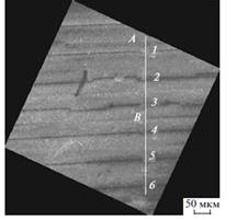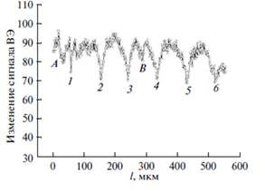 Рис. 8 - РЭМ изображение (а) и профиль сигнала ВЭ по линии пересекающей границы “голова-к-голове” (А и В) и “хвост-к-хвосту” (№ 1–6) при избыточной отрицательной зарядке поверхности образца, Е = 3.5 кэВ (б). |