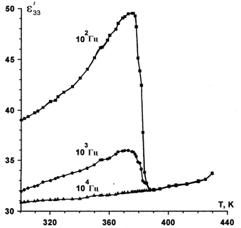 Рис.9 - Температурная зависимость диэлектрической проницаемости кристалла LiNbO3:Gd [0.44 мас. %] (Z-ориентация) на фиксированных частотах |