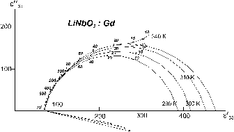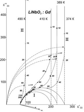 Если при увеличении температуры в диапазоне 290 – 340К глубина дисперсии дисперсионного процесса (I) несущественно возрастала (рис. 10 а), то дальнейшее незначительное увеличение температуры выше 340K приводит к радикальному снижению глубины дисперсии, рис. 10 б. На диаграммах Коула-Коула при повышении температуры появляются линейные участки в низкочастотной области. По мере увеличения температуры линейные участки становятся более выраженными и протяженными, время релаксации, соответствующее дебаевскому процессу (I), резко возрастает (рис. 10 б). Выше 410К дебаевская дисперсия (I), подавляется до полного исчезновения (рис.11). В области температур ~ К проявляются два дисперсионных процесса: дебаеcкий процесс (I), описываемый дугой окружности, и линейный участок, лежащий в области более низких частот (II), обозначенный на рис. 10 б как процесс (II). Из диаграмм следует, что в при температурах ~ 290 – 340 К в диапазоне частот ~ 0.5 Гц – 10 кГц диэлектрическая дисперсия LiNbO3:Gd обусловлена единственным релаксационным процессом дебаевского типа (рис. 10 а). Исследования дисперсии комплексной диэлектрической проницаемости в смещающих электрических поляхкВ/см) свидетельствуют о том, что приложение смещающего поля даже при комнатной температуре значительно снижает глубину дисперсии дисперсионного процесса (I), но не меняет ее дебаевский характер.