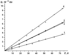 | Рис.11 - Статический пьезоэлектрический эффект в образцах LiNbO3:Tm [0.13мас. %] 1- T=290К d33=4,8·10-12 Кл/Н ; 2- T=364К d33=8,6 ·10-12 Кл/Н, нагрет в 1 термоцикле; 3- T=290К d33=8,5·10-12 Кл/Н, охлажден в 1термоцикле; 4- T=290К d33=12,8 ·10-12 Кл/Н, монодоменный образец |