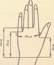 Итак, перчатки вяжут по кругу на пяти спицах, начиная от запястья. Выполняют различными плотными и ажурными узорами, чулочным вязанием с орнаментом или цветными полосами. Расход пряжи приблизительно такой же, как и для варежек от 40 до 130 г. Знакомство с техникой вязания перчаток лучше начать с более простого варианта, когда они выполняются чулочной вязкой. Для тренировки свяжите левую перчатку. Приступая к работе, прежде всего, снимите мерки: