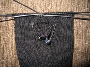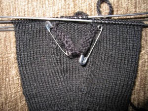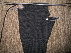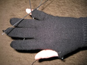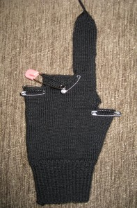 Отверстие для мизинца. Петли мизинца расположены в конце 2-й спицы и начале 3-й. Свяжите петли 2-й спицы до петель мизинца и снимите 9 непровязанных петель на булавку. На другую булавку посадите 7 петель с 3-й спицы. После