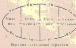 Распределение петель для четырех пальцев. Наиболее простой способ деления петель перчатки на 8 частей: 60 п.: 8 = 7п. (4 п. в остатке). Для каждого пальца по 2 части одну для верхней половины, другую для нижней (7п. + 7п. = 14 п.) остаток распределяют поровну, присоединив его к петлям верхних половинок: 7п. +1 п. = 8п. Теперь на каждый палец приходится 15 петель. Если остаток меньше четырех единиц, его прибавляют к петлям пальцев, начиная с указательного. Затем к петлям указательного пальца присоединяют еще 2 (15п. + 2п.= 17п.), вычтя их из петель безымянного (15п. – 2п. = 13п.). Итак, для мизинца — 15 петель, для безымянного пальца — 13 петель, для среднего 15 петель, для указательного — 17 петель. Далее в процессе вязания образуют между пальцами перемычки из воздушных петель Полученный результат наносят на схему и вяжут, ориентируясь на нее (цифры на схеме, подписанные карандашом, это мои):