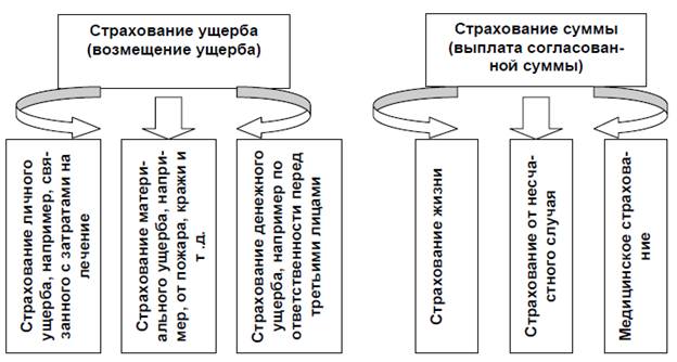 Классификация страхования по видам страховых выплат (рис. 2) построена на соотношении страховой суммы и страхового возмещения за понесенный ущерб, на основании чего различают страхование ущерба и страхование суммы. При страховании ущерба выплата страхового возмещения осуществляется на основе необходимой потребности в покрытии потерь и ограничивается фактической стоимостью объекта страхования, выраженной в страховой сумме.