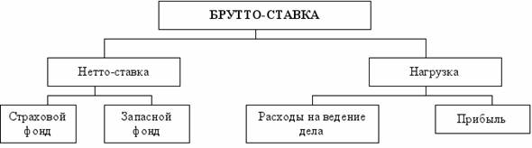 Тарифная ставка, по которой заключается договор страхования, носит название брутто-ставки (рис.3). В свою очередь брутто-ставка состоит из двух частей: нетто-ставки и нагрузки. Нетто-ставка предназначена для формирования страхового фонда, который используется для страховых выплат страхователям (страхового обеспечения - при личном страховании и страхового возмещения – при имущественном страховании), то есть для выполнения финансовых обязательств страховщика по договорам страхования.