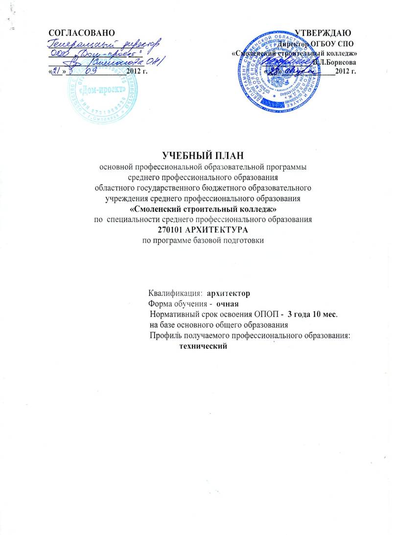 Настоящий учебный план основной профессиональной образовательной программы среднего профессионального образования ОБГОУ СПО «Смоленский строительный колледж» разработан на основе федерального государственного образовательного стандарта по специальности среднего профессионального образования (далее – СПО) 270101 АРХИТЕКТУРА, утвержденного приказом Министерства образования и науки Российской Федерации № 000 от 15.г., зарегистрированного Министерством юстиции (рег. № 000 от 01.01.2001 г.)