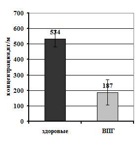Содержание ИЛ-12 в сыворотках здоровых доноров составило 534±82 пг/мл и 187±53 пг/мл (р<0,05) в сыворотках больных ГГ. ИФγ выявлялся в сыворотках в незначительной концентрации (4±3 пг/мл у здоровых доноров и 9±7 пг/мл у больных ГГ), при этом достоверных отличий по его уровню между группами выявлено не было (Рис.1). В тоже время необходимо отметить, что ИЛ-12 выявлялся в сыворотке 100% обследованных доноров и больных, в то время как ИФγ – у 20% здоровых доноров и у 80% больных герпесом.