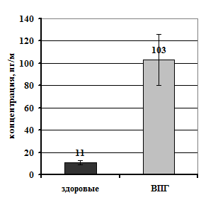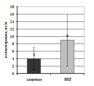 Рисунок 1. Концентрация ИЛ-12 и ИФγ в сыворотке здоровых людей и больных рецидивирующим генитальным герпесом.