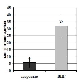 Рисунок 2. Концентрация ИЛ-12 и ИФγ в отделяемом из уретры больных рецидивирующим ГГ по сравнению со здоровыми людьми.