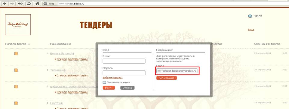 В открывшемся окне справа, в поле Email ввести адрес электронной почты, на который будет выслано подтверждение регистрации: