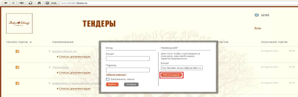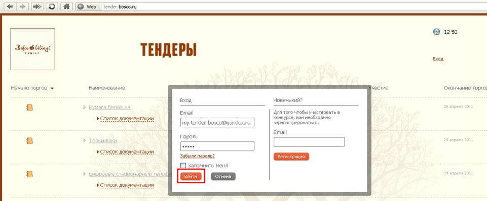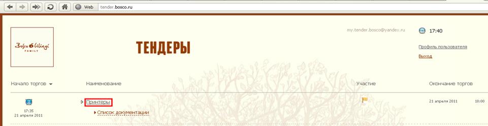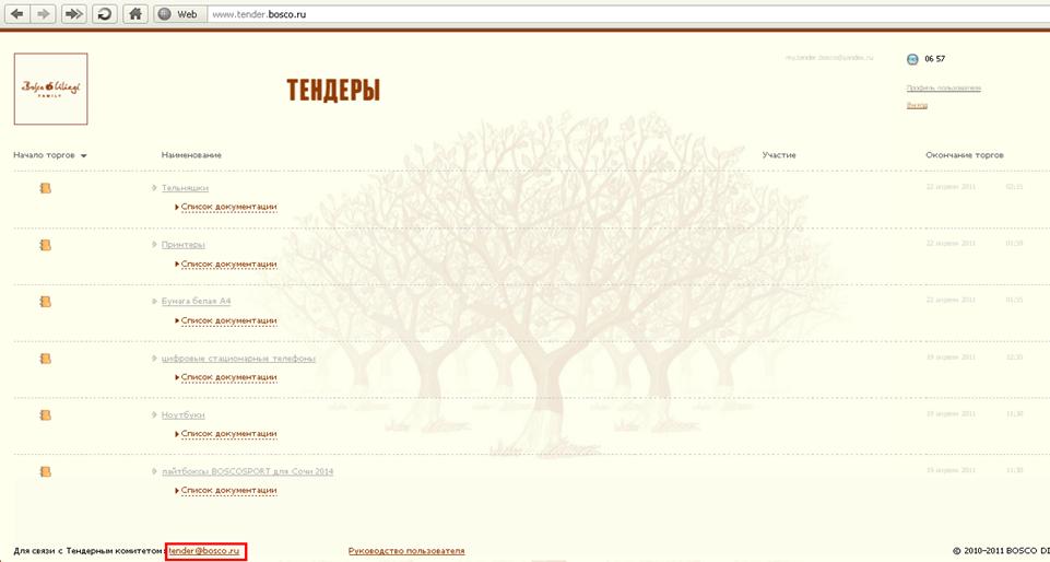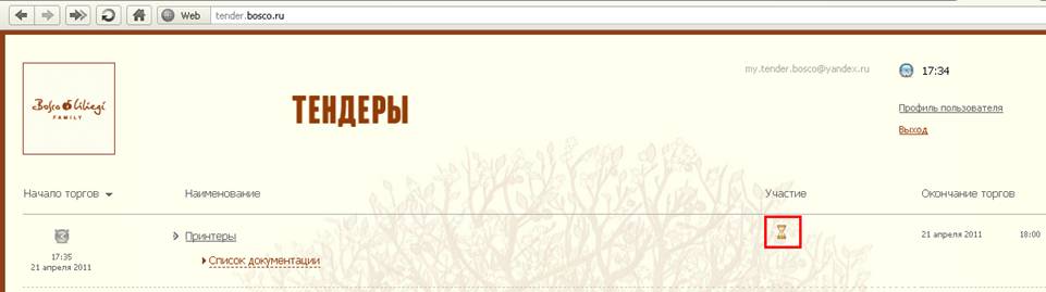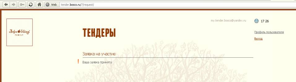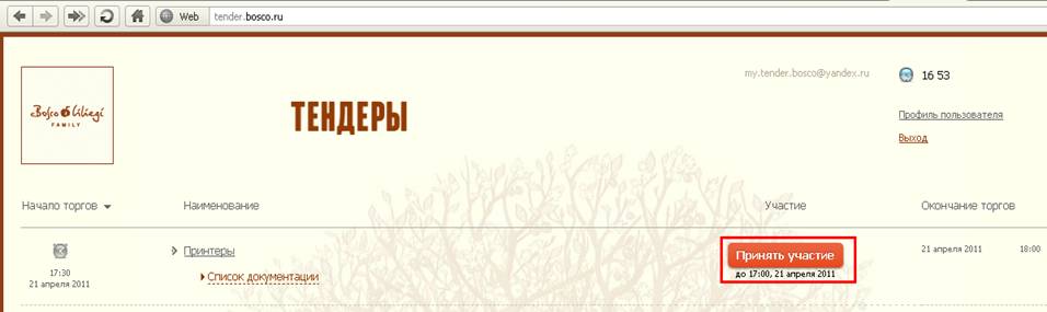 Если по результатам анализа Тендерной документации Пользователь принял решение об участии в активном Тендере, ему необходимо подать заявку в Тендерный комитет группы компаний Bosco di Ciliegi. Для этого напротив выбранного Тендера следует нажать на кнопку "Принять участие":