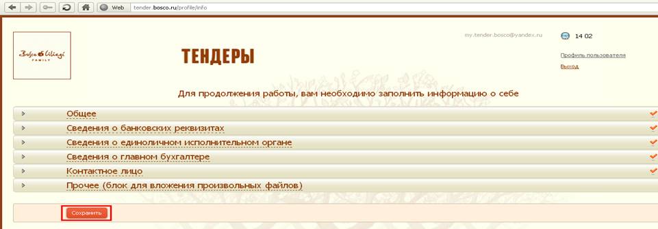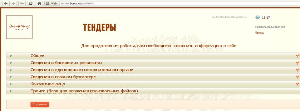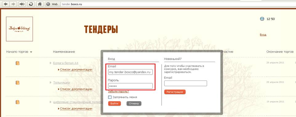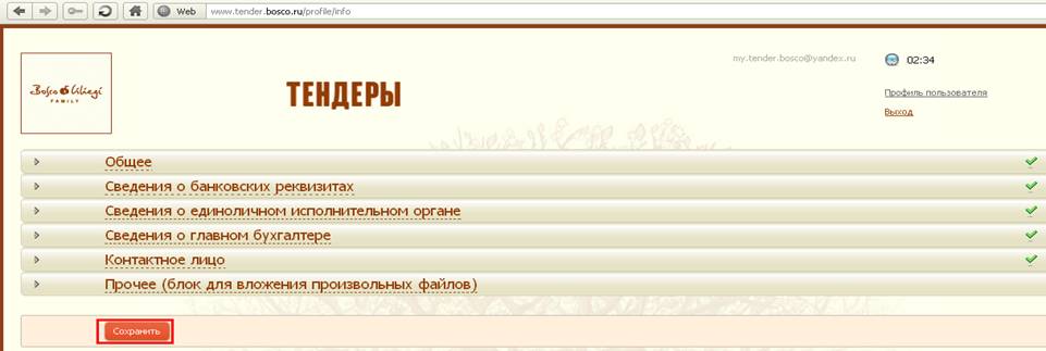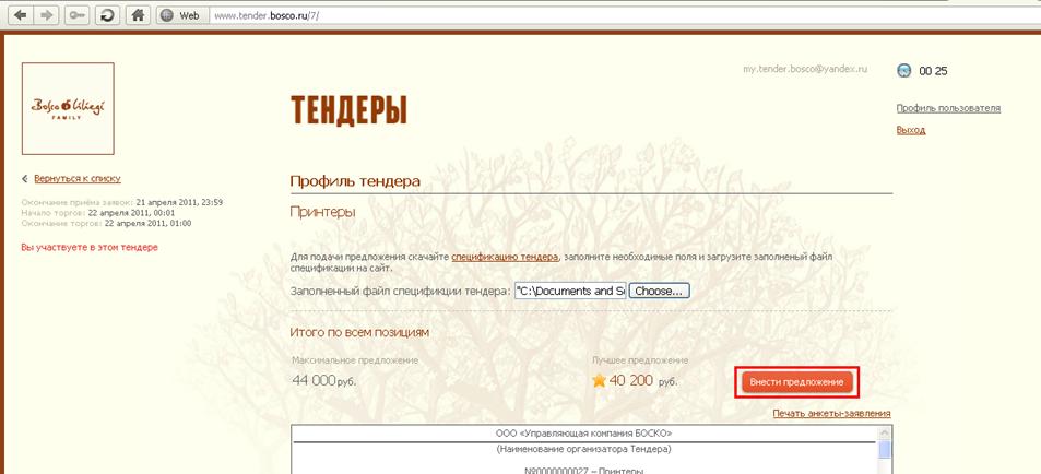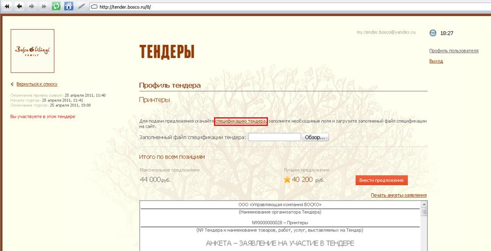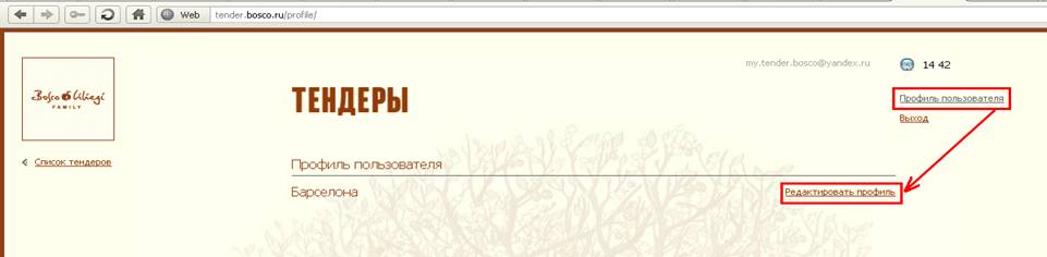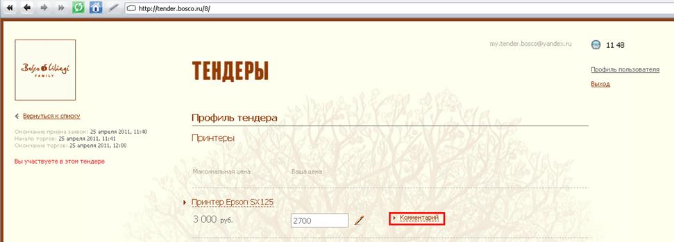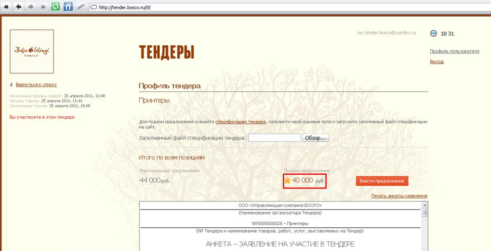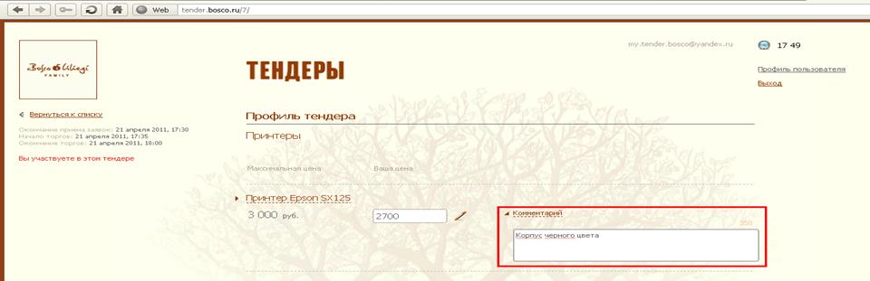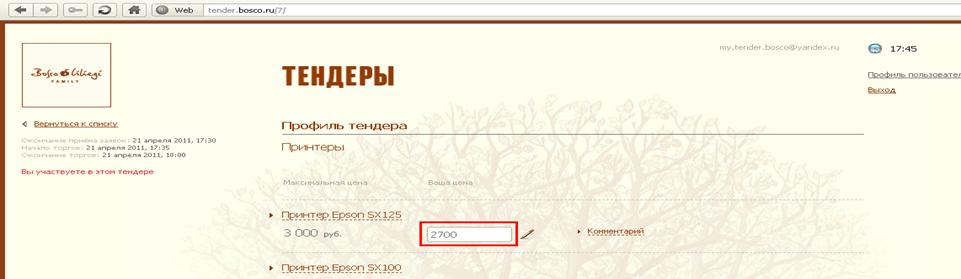 После входа в Систему у зарегистрированного Пользователя появляется возможность редактировать свой Профиль, подать Заявку на участие в Тендере, принять участие в Конкурсе цены: