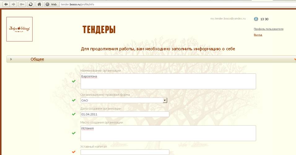 При первом входе в Систему необходимо заполнить Профиль Пользователя: