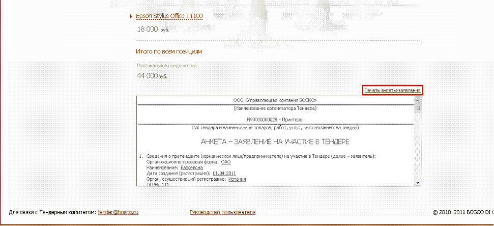 С момента подачи Заявки на участие в Тендере у Пользователя есть возможность распечатать из Профиля Тендера АНКЕТУ-ЗАЯВЛЕНИЕ для подачи в Тендерный комитет письменной Тендерной Заявки.