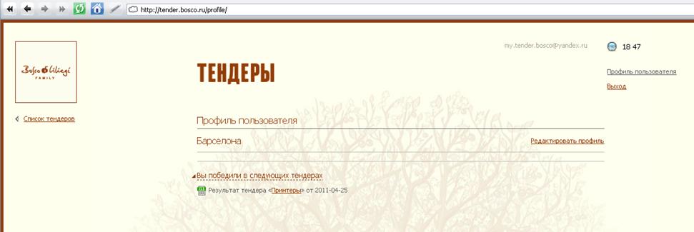 Результаты Тендера также размещаются в Профиле Пользователя – Победителя Тендера: