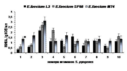Антагонистический эффект пробиотических культур по отношению к энтерококкам был выражен слабее, чем к стрептококкам. Для подавления их роста требовалась довольно большая концентрация бактерий антагонистов. Среднее значение МИКА для энтерококков составило 5,02 lg КОЕ/мл. Вместе с тем колебания данного показателя широко варьировали (от 2,14 до 7,05 lg КОЕ /мл).