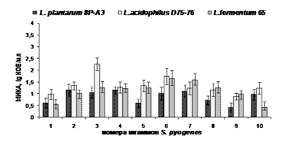 При сравнительном анализе полученных результатов впервые были отмечены общие тенденции в показателях МИКА для стрептококков, относящихся к определенным серологическим группам. Максимальное антимикробное действие лактобактерий проявлялось по отношению к штаммам S. pyogenes, для которых среднее значение показателей МИКА составило 1,19 lg КОЕ/мл. Наибольшую резистентность проявляли штаммы S. agalactiae (серогруппа В), среднее значение МИКА для которых составляло 4,15 lg КОЕ /мл. Стрептококки серологических групп C и G обладали промежуточной чувствительностью к действию антимикробных факторов молочнокислых бактерий, средние значения МИКА для них определялись как 2,66 и 3,46 lg КОЕ/мл, соответственно.