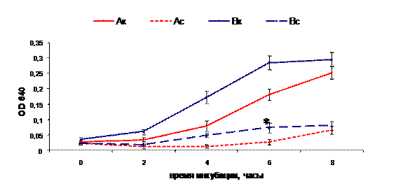 Рис. 2. Влияние супернатанта культуры E. faecium L3 на рост S. pyogenes и S. agalactiae (средние значения): Ак, Вк – контроль роста S. pyogenes и S. agalactiae, Ас, Вс – рост S. pyogenes и S. agalactiae в присутствии супернатанта