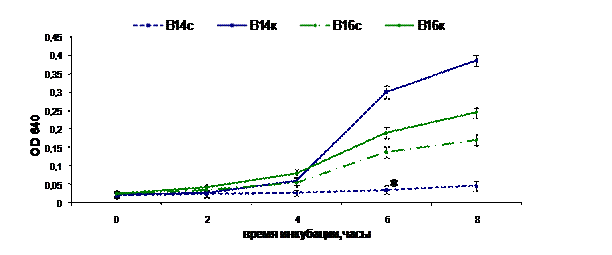 Рис. 3. Влияние супернатанта культуры E. faecium L3 на рост штаммов S. agalactiaе: В14с, В16с – рост штаммов S. agalactiaе 14 и 16 в присутствии супернатанта; В14к, В16к – контроль роста штаммов S. agalactiaе 14 и 16