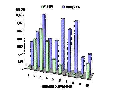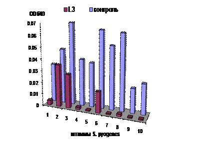 Отмечалась взаимосвязь между ростовыми особенностями индикаторных культур и степенью их чувствительности к совокупности антимикробных факторов молочнокислых бактерий. Как правило, штаммы, растущие менее интенсивно, демонстрировали более высокую чувствительность. Так штаммы стрептококков группы А (S. pyogenes), растущие медленнее, чем штаммы других серологических групп, проявляли максимальную чувствительность к ингибирующему действию супернатантов лактобактерий. А стрептококки группы В (S. agalactiae), обладающие более интенсивным ростом, в присутствии супернатантов тех же пробиотических культур, как правило, подавлялись в меньшей степени (рис. 2). В то же время некоторые медленнорастущие штаммы индикаторных стрептококков обнаруживали устойчивость к действию супернатантов молочнокислых культур; и наоборот, рост отдельных интенсивно растущих индикаторных