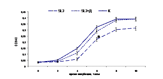Рис. 5. Влияние супернатанта культуры E. faecium L3, из которого путем диализа были удалены метаболиты, имеющих молекулярную массу менее 1 kDa, на рост S. agalactiaе (штамм В13): SL3 – супернатант, SL3+Д – супернатант после диализа, К – контроль роста S. agalactiaе В13