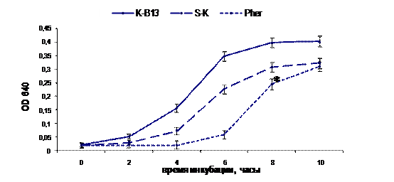 Рис. 8. Влияние супернатантов, полученных из культуры E. faecium L3, на рост S. agalactiae B13: К-B13 – контроль роста стрептококков, S-K – обычный супернатант, Pher – супернатант, полученный после добавления синтетического индуктора Pher-2