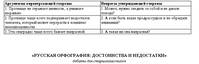На предварительном этапе участники дебатов делятся на команды: утверждающая доказывает, что в прозвище нет ничего обидного, т. е. прозвище то, кто ты есть. Опровергающая доказывает, что прозвище - это обидно, унизительно, оскорбительно. Судьям придется решить, чьи доводы окажутся наиболее убедительными.
