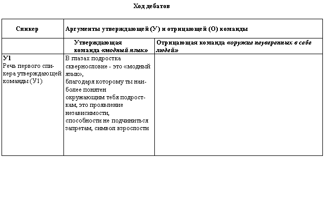 У1 кО2 Первый спикер утверждающей команды задает вопросы второму спикеру отрицающей команды | Известен ли уважаемому оппоненту тот факт, что в 19 веке сквернословие постепенно из ругани превратилось в основу языка фабричных рабочих и мастеровых? Грубая брань звучала сначала в кабаках, а потом выплеснулась на улицы городов | |