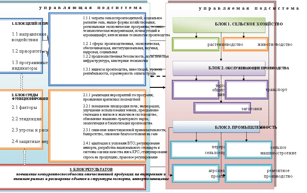 Модель системы управления, регулирования и защиты АПК, реализуемая с учетом адаптации управляющей и управляемой подсистем к среде функционирования в условиях ВТО (рисунок 5[13]). Ресурсные рынки АПК обеспечивают удовлетворение спроса сельского хозяйства на материально-технические и другие ресурсы, что требует формирования оптимальной среды инновационного развития производственного потенциала предприятий сельхозмашиностроения. Действующая система управления АПК отличается несовершенством организации, что проявляется в отсутствии инициативы со стороны управляемой подсистемы в целом и ее основных элементов – субъектов хозяйствования в сельском хозяйстве, обслуживающих производствах и промышленности. Не соответствует современным требованиям и уровень интеграции между сферами АПК. Предлагаемая блочная модель системы управления, регулирования и защиты АПК позволит обеспечить повышение конкурентоспособности отрасли на качественно новой технологической платформе при условии полноценного целевого использования средств, заложенных в Государственной программе.