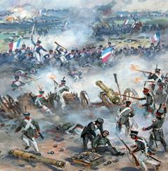 ... 14 часов 7 сентября 1812 года. Кутузов закончил перегруппировку войск, благодаря смелым отвлекающим действиям конницы в тылу противника. Укреплены позиции на батарее Раевского. Французы снова атакуют на этом направлении. Развернувшаяся борьба распалась на ряд отдельных боев и затянулась до 15 часов 30 минут. На этот раз в атаке приняли участие три пехотные и три кавалерийские дивизии неприятеля. Пехотные колонны наносили удар с фронта, одна кавалерийская дивизия атаковала во фланг с севера и две кавалерийские дивизии с юга. Багратионовы флеши и Семеновская позиция в это время были уже в руках французов, а это позволяло им глубоко охватить батарею Раевского с юга.