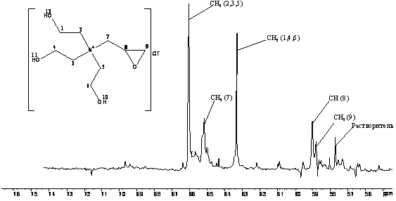 Спектры ЯМР 1Н и 13С (в режиме СОМ и JMOD) записаны на спектрометре Bruker АМ-300 (рабочая частота прибора 300 МГц (1Н) и 75.47 МГц (13С)). В качестве внутренних стандартов и растворителей использовали СDCl3, C6D12. На рисунке 8 представлен ЯМР-спектр N-(2,3-эпоксипропил)-триэтаноламмонийхлорида на 13С.