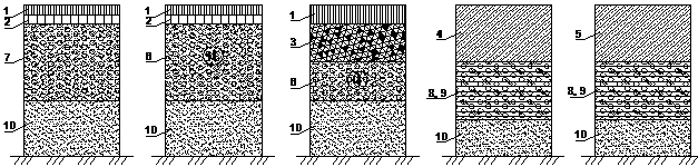 Рисунок 13 Конструкции дорожных одежд капитального типа Конструктивные слои дорожной одежды: 1 - плотный асфальтобетон; 2 - пористый асфальтобетон; 3 –черный щебень; 4 – монолитный цементобетон; 5 – сборные железобетонные плиты; 6 – щебеночно-песчано-цеметные смеси (ЩПЦС); 7 – щебеночн-песчаные смеси (ЩПС); 8 – каменные материалы, обработанные неорганическими вяжущими; 9 – грунты, обработанные неорганическими вяжущими; 10 – песчаный подстилающий слой.