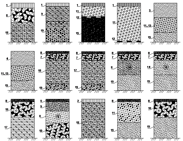 Рисунок 14. Конструкции дорожных одежд облегченного типа Конструктивные слои дорожной одежды: 1 – горячий асфальтобетон; 2 – холодный асфальтобетон; 3 – монолитный цементобетон; 4 – сборные железобетонные плиты; 5 – двойная поверхностная обработка; 6 – поверхностная обработка; 7 – черный щебень; 8 – каменные материалы, обработанные неорганическим вяжущим; 9 – гравийные, гравийно-песчаные смеси, укрепленные комплексными вяжущими; 10 – каменные материалы, обработанные органическим вяжущим; 11- щебень, щебеночные смеси; 12 - армирующая сетка; 13–гравийно-песчанные подобранные смеси; 14 – пески, укрепленные полимерорганическим вяжущим; 15 – подстилающий песчаный слой; 16 – грунт, укрепленный органическими вяжущими; 17 – грунт, укрепленный комплексными вяжущими; 18 – грунт, укрепленный неорганическими вяжущими; 19 – грунты, укрепленные карбамидоформальдегидной смолой.