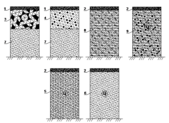 Рисунок 15. Конструкции дорожных одежд переходного типа Конструктивные слои дорожной одежды: 1 – поверхностная обработка; 2 – двойная поверхностная обработка; 3 – щебеночные, гравийно-песчаные смеси, обработанные органическими вяжущими; 4 – органоминеральные смеси с жидкими органическими вяжущими совместно с минеральными; 5 –песчано-гравийные смеси, укрепленные неорганическими вяжущими; 6 –пески, укрепленные неорганическим вяжущим; 7 – подстилающий песчаный слой; 8 – грунты, укрепленные неорганическим вяжущим; 9 – грунты, обработанные комплексным вяжущим (битумная эмульсия и цемент).