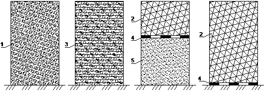 Рисунок 16. Конструкции дорожных одежд низшего типа Конструктивные слои дорожной одежды: 1 – гравийно-песчаная смесь; 2 - щебеночный или шлаковый слой; 3 – грунт, укрепленный или улучшенный добавками; 4 - армирующая сетка; 5 - подстилающий песчаный слой.