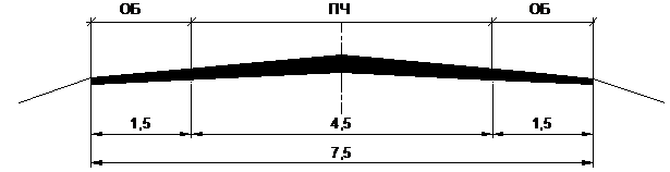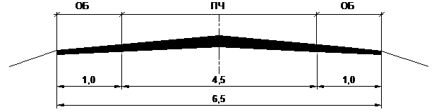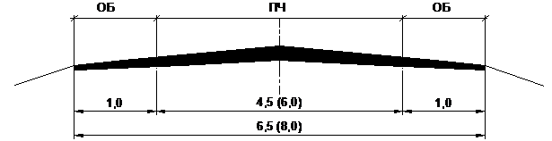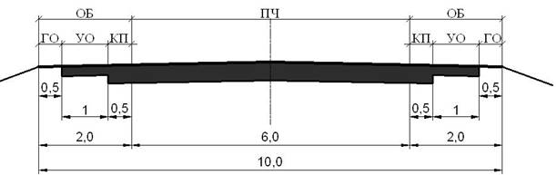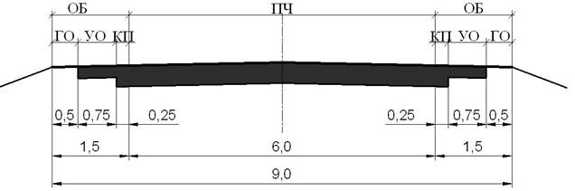 где ПЧ – проезжая часть, КП – краевая полоса у обочины, ОБ - обочина, УО – укрепленная часть обочины, ГО - ширина грунтовой части обочины. Размеры геометрических элементов даны в метрах.