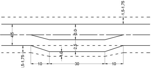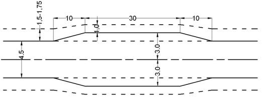 Переход от однополосной проезжей части к двухполосной осуществляют на протяжении не менее 10 м.