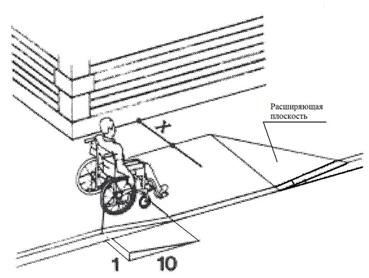 Если пандус расположен на тротуаре, по которому осуществляется пешеходное движение поперек или он не разделен перилами или поручнем, то максимальный уклон расширяющейся стороны принимают не более 1:10.