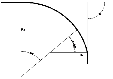Угол поворота, град | Входная кривая R1,м | Выходная кривая R2, м |