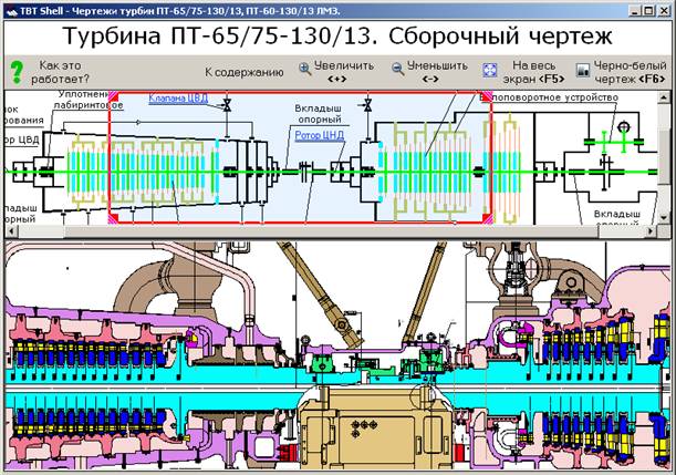 В комплексе представлено большое количество электронных чертежей, созданных с помощью AutoCad. Все чертежи снабжены удобным и достаточно простым средством просмотра, т. е. для работы с ними не требуются специальные навыки и большой опыт работы с компьютером. Для удобства пользователя реализована возможность просмотра схемы чертежа. Например, при работе со сборочным чертежом паровой турбины, который имеет достаточно большие размеры, можно вывести на экран упрощенную схему данного чертежа. По схеме движется прямоугольная рамка. Местоположение рамки на схеме показывает элемент сборочного чертежа, который в данный момент просматривает пользователь. Кроме того, на схеме обозначены некоторые части сборочного чертежа (например, ротор низкого давления, либо стопорный клапан на схеме сборочного чертежа паровой турбины). Щелкнув мышью на одно из таких обозначений, пользователь перейдет к чертежу соответствующей детали.
