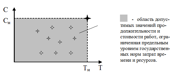 В осях стоимости и продолжительности графическая интерпретация результатов такого вариантного проектирования строительного процесса будет иметь следующий вид: