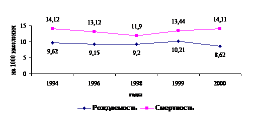Как мы видим, динамика рождаемости остаётся практически неизменной до 1999г., в дальнейшем же она начинает снижаться незначительными темпами с 10,21 до 8,62. Что касается смертности, то она также незначительно колеблится, но, начиная с 1999г. возрастает и доходит практически до уровня 1994г.–14,12.